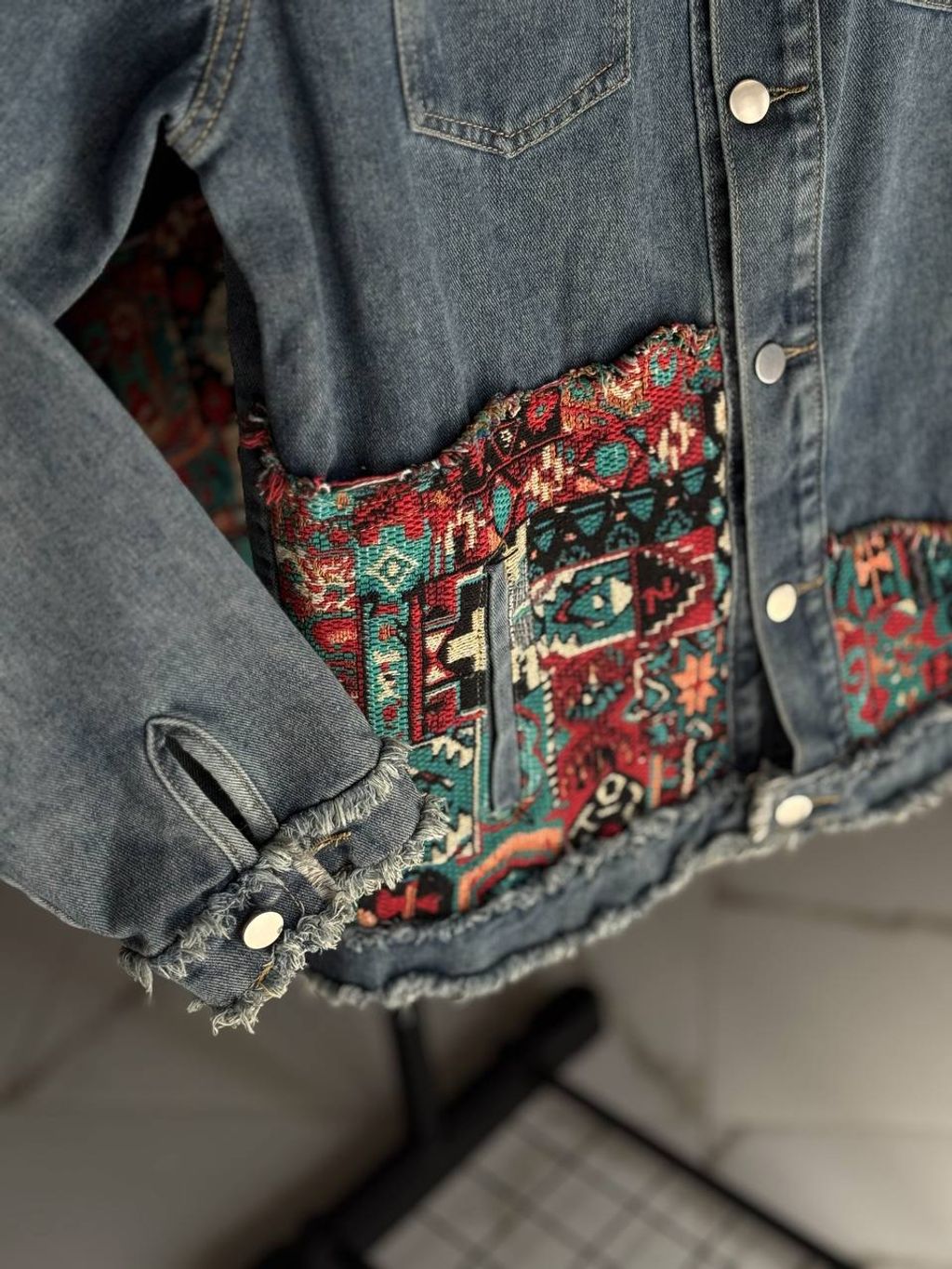 Жіноча джинсова куртка з декоративними нашивками в екно стилі  Ковер BlueЖіноча джинсова куртка з декоративними нашивками в екно стилі  Ковер Blue Жіноча джинсова куртка з декоративними нашивками в екно стилі  Ковер Blue
